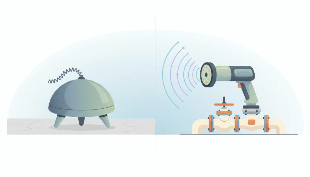 [FAQ-Q] Posso usar um aplicativo de celular para achar vazamento? [FAQ-A] Eu serei direto: Não. Existem apps que prometem transformar o microfone do celular em geofone, mas a sensibilidade do hardware do smartphone é insuficiente para atravessar concreto e cerâmica. Você vai perder tempo. A física acústica exige sensores piezoelétricos de contato, algo que nenhum celular possui nativamente.